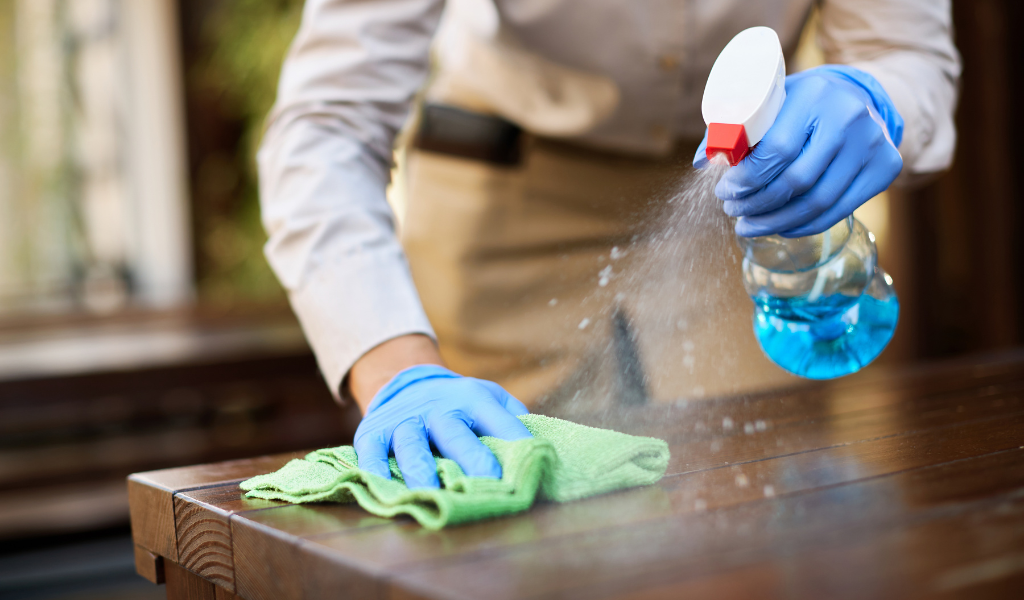 - Countertops, stoves, and backsplashes are cleaned and sanitized.